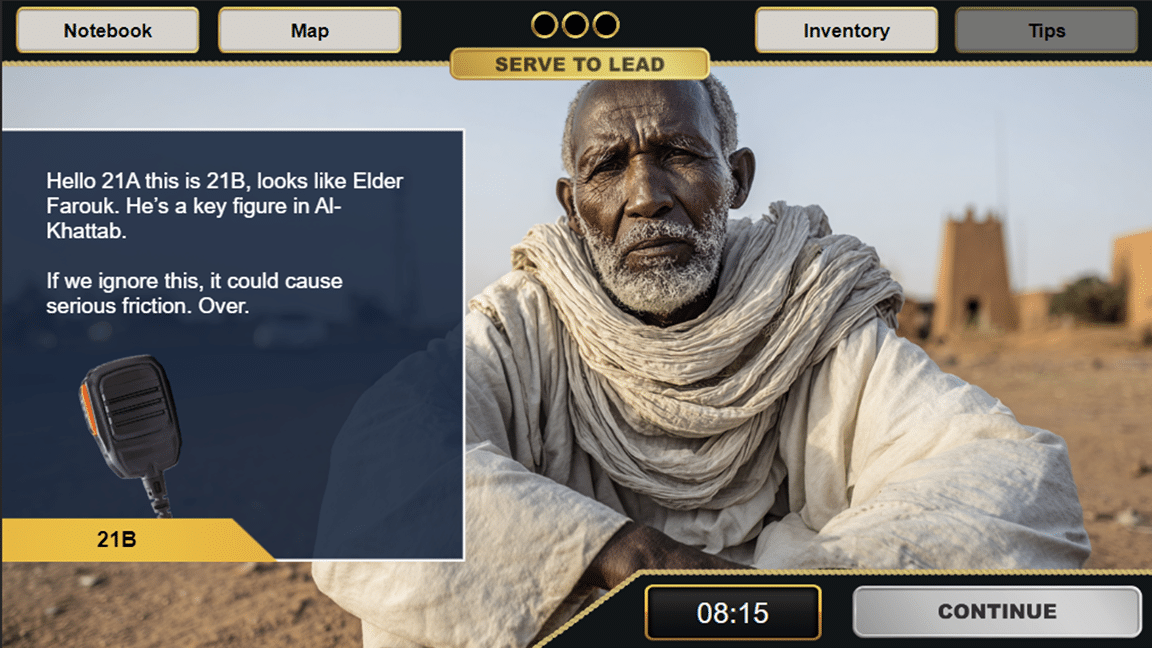 Serve to Lead is a bespoke digital training game developed for the Royal Military Academy Sandhurst (RMAS) in partnership with CDS Defence & Security. Designed as a pick-your-own-adventure branching narrative, it immerses Officer Cadets in the role of a newly appointed Platoon Commander. Across a 45-minute online scenario, players confront real-world inspired situations spanning welfare, discipline, harassment reports, and human rights dilemmas, in both barracks and deployed environments. Each playthrough concludes with a face-to-face facilitated session, allowing Instructing Staff to consolidate lessons and tailor discussion according to the individual needs and performance of the players. By combining immersive digital play with structured reflection, Serve to Lead provides a scalable and innovative method of enhancing ethical decision-making, leadership competence, and officer development.